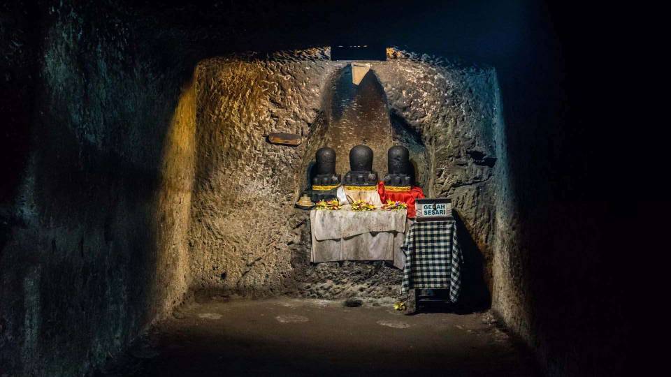 In the northern part of the temple, lies a carved Cave of Nature in the shape of the letter ”T”. Inside this Goa Gajah Temple cave there is a Ganesha statue considered as the god of sciences. Additionally, at the location can also be encountered some fragments of statues and a Trilangga surrounded by eight small phallus. In the Goa Gajah Temple cave wall, there are niches of the hermitage and the face of Cave is decorated with carvings depicting a jungle with its contents. Similarly, there is a short inscription which reads ”Kumon” and ”Sahywangsa”, which according to the type of letters it is alleged to originate in the eleventh century AD.