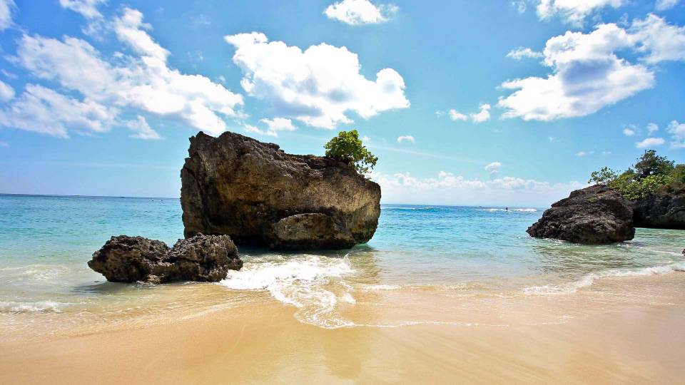 Padang Padang Beach is one of the best beaches in Bali in addition to dreamland, Kuta and Nusa Dua. White sandy beach stretching ahead of you, clear blue water and flat, perfect for swimming. Sand white color contrasts with the black rocks and blue sea exotic. Padang Padang Beach was clean, quiet atmosphere and crystal clear waters will make us feel at home after a long time to swim and sunbathe here. The more the light rays of the sun adds to the more exotic blue waters are shown. A bright blue sky and white clouds forming harmonization beautiful scenery. Visible in the distance the boulder clusters, this is so beautiful. Large boulders are scattered along the coast.